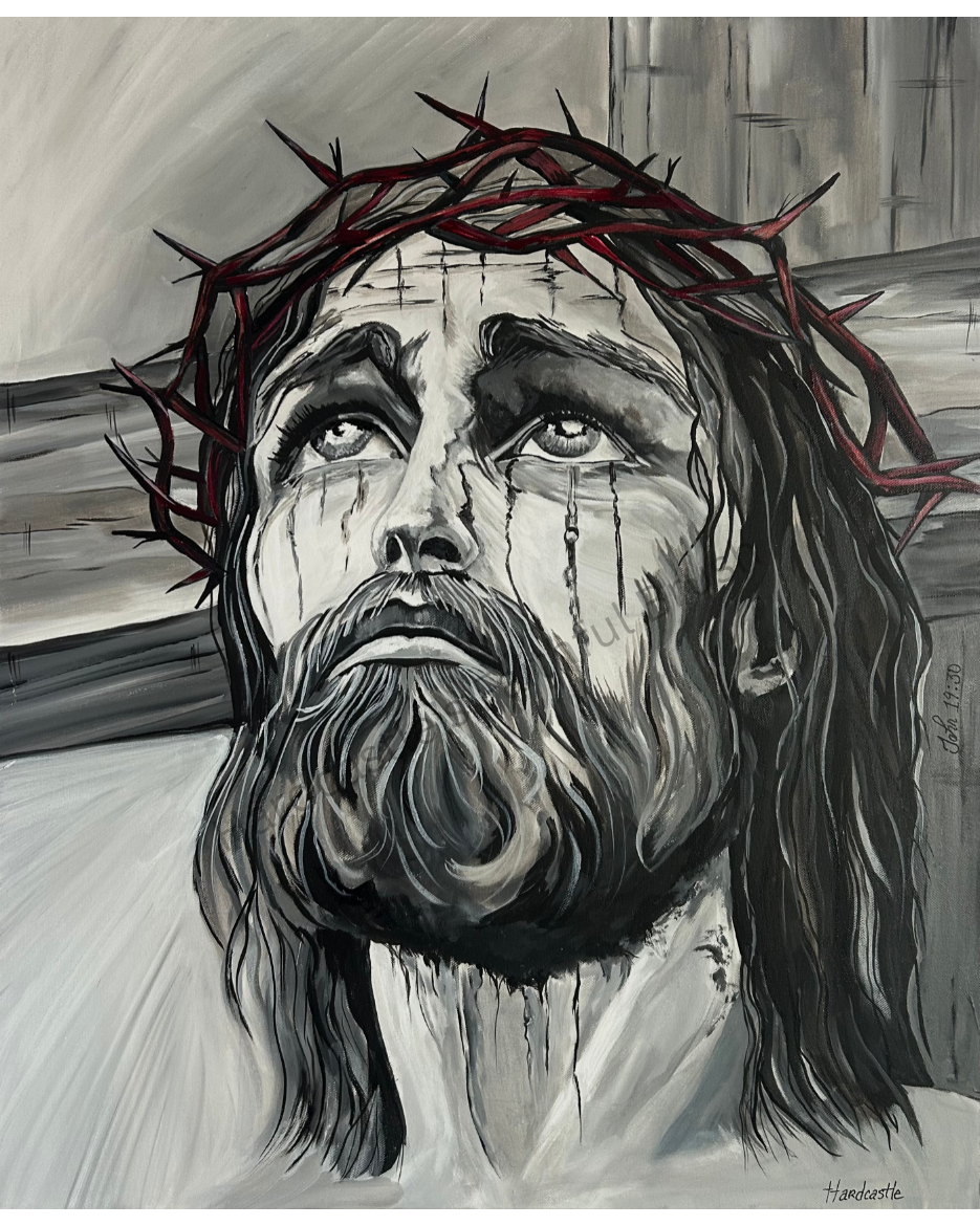This painting reflects my journey seeking clarity and guidance as I follow Jesus into a new chapter. It depicts Jesus gazing heavenward in gentle rain, praying to God, inspired by John 17:1, where he seeks strength and glorifies the Father. The rain represents challenges and renewal, while his serene expression and wet robe convey trust and humanity. My friend's insight in naming it The Great Intercessor captures Jesus' role praying for us all, lighting my path through uncertainty.
